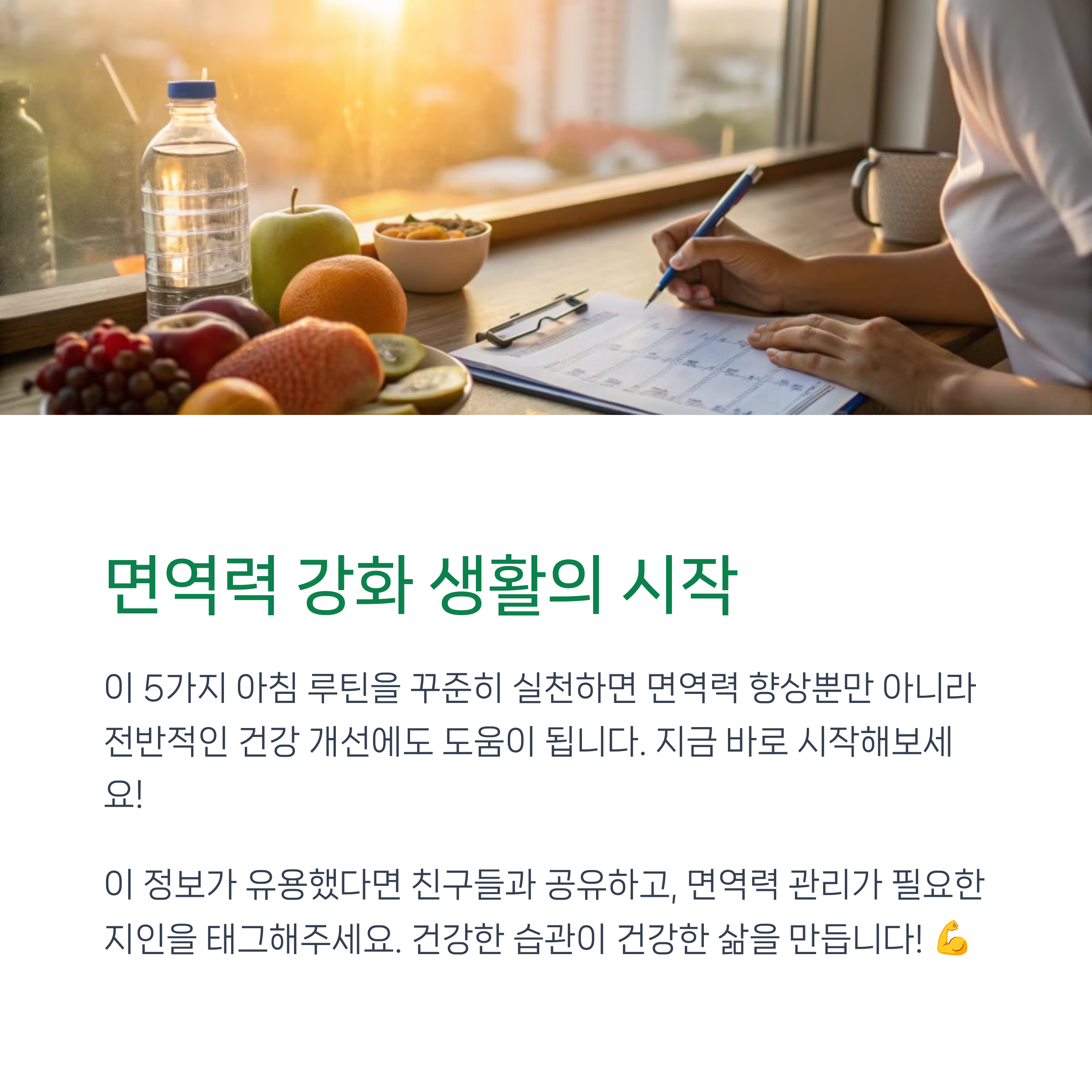 오늘 하루의 시작이 내 몸의 면역력을 결정합니다. 조금 더 일찍 일어나 햇빛을 쬐고, 수분을 보충하고, 가벼운 스트레칭이나 걷기를 실천하는 것만으로도 몸은 건강한 리듬을 회복할 수 있습니다. 또한 건강한 아침 식사를 통해 부족한 영양소를 채워준다면, 외부 바이러스에 대한 방어력도 확실히 높아집니다. 오늘 소개한 5가지 아침 루틴을 꾸준히 실천한다면 면역력은 자연스럽게 강화되고, 계절이나 환경에 흔들리지 않는 건강한 일상이 만들어질 것입니다.