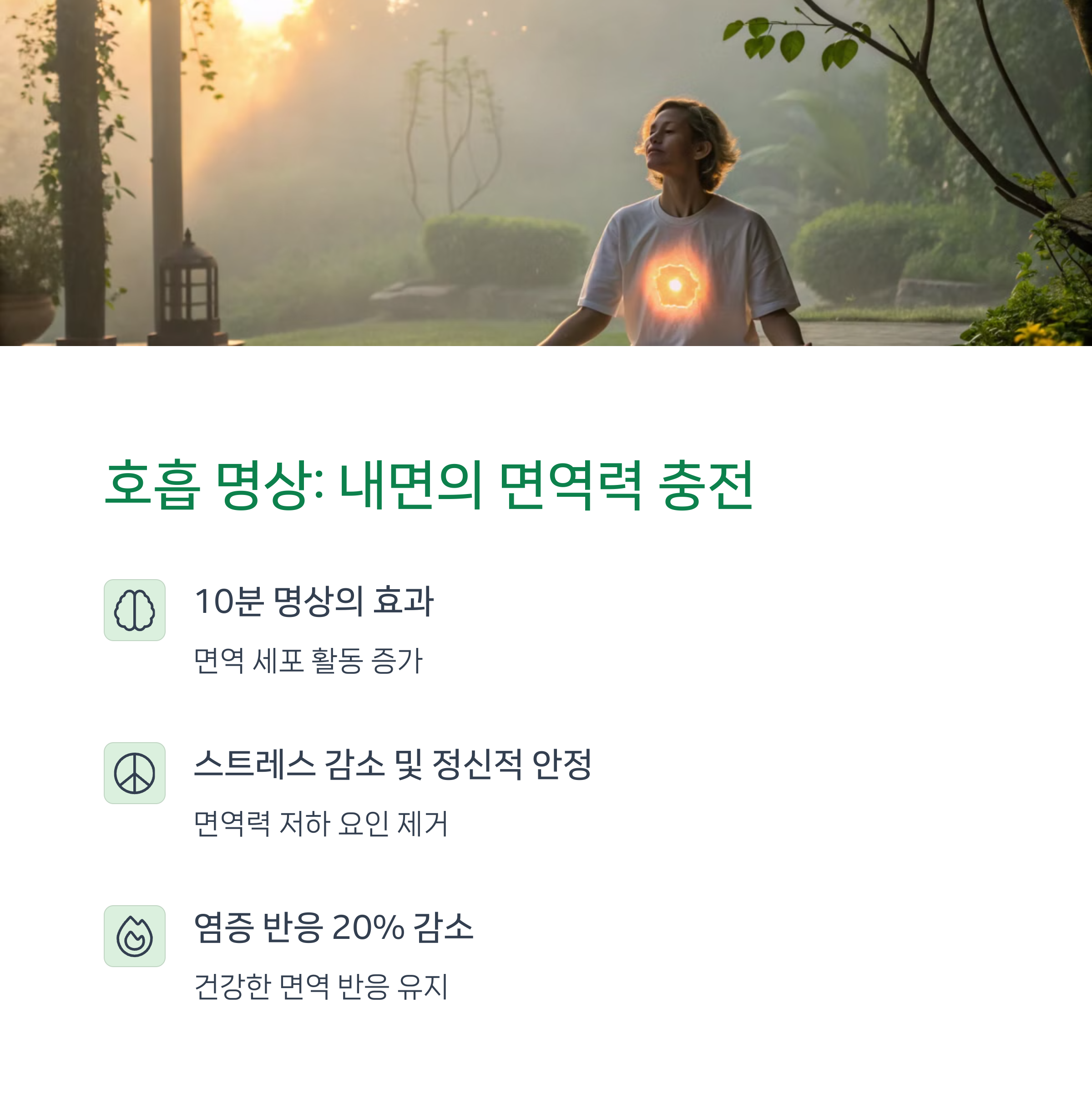두 번째로 중요한 루틴은 공복 유산소 운동입니다. 아침 식전 10~15분 가볍게 걷는 것만으로도 체내 순환과 림프 흐름이 활발해지며 면역세포가 더 효율적으로 작동합니다. 특히 집 근처 공원이나 자연이 있는 공간에서 걷는다면 심리적 안정감까지 함께 얻을 수 있어 정신 건강에도 긍정적인 영향을 줍니다. 또 하나, 간단한 명상이나 호흡 조절은 아침 루틴에서 절대 빼놓을 수 없는 요소입니다. 깊고 규칙적인 호흡은 자율신경계의 균형을 잡아주고, 스트레스로 인한 면역 저하를 막는 데 큰 효과를 발휘합니다.