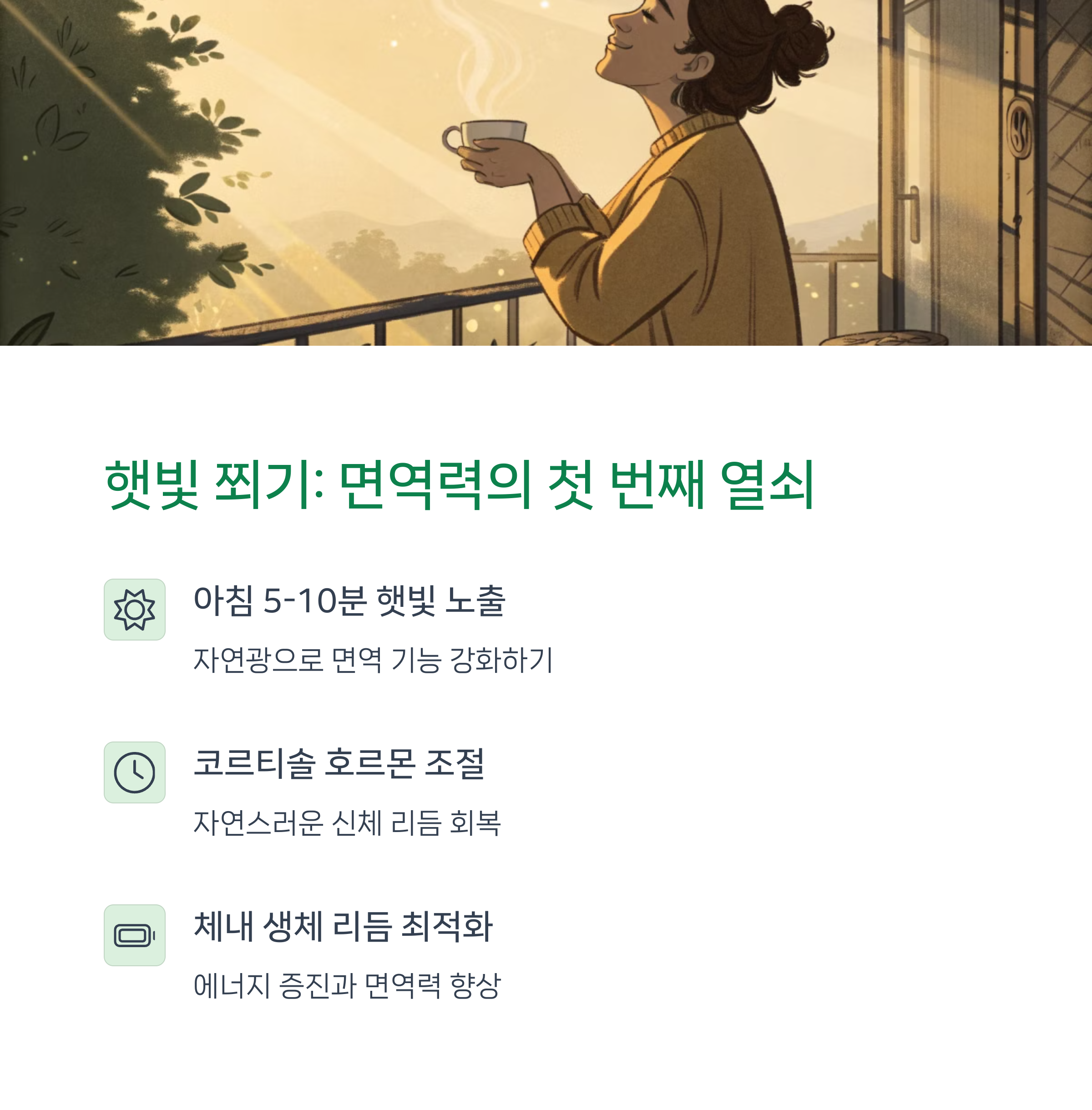 아침 루틴은 단순히 하루를 시작하는 행위 이상의 의미를 가지고 있습니다. 일어나자마자 어떤 행동을 하느냐에 따라 몸의 각 기관은 서로 다른 반응을 보이며 그에 따라 면역 체계의 균형 또한 달라집니다. 아침 햇빛을 받으며 일어나는 것만으로도 세로토닌 분비가 증가하고, 이는 면역세포의 활동성을 촉진합니다.