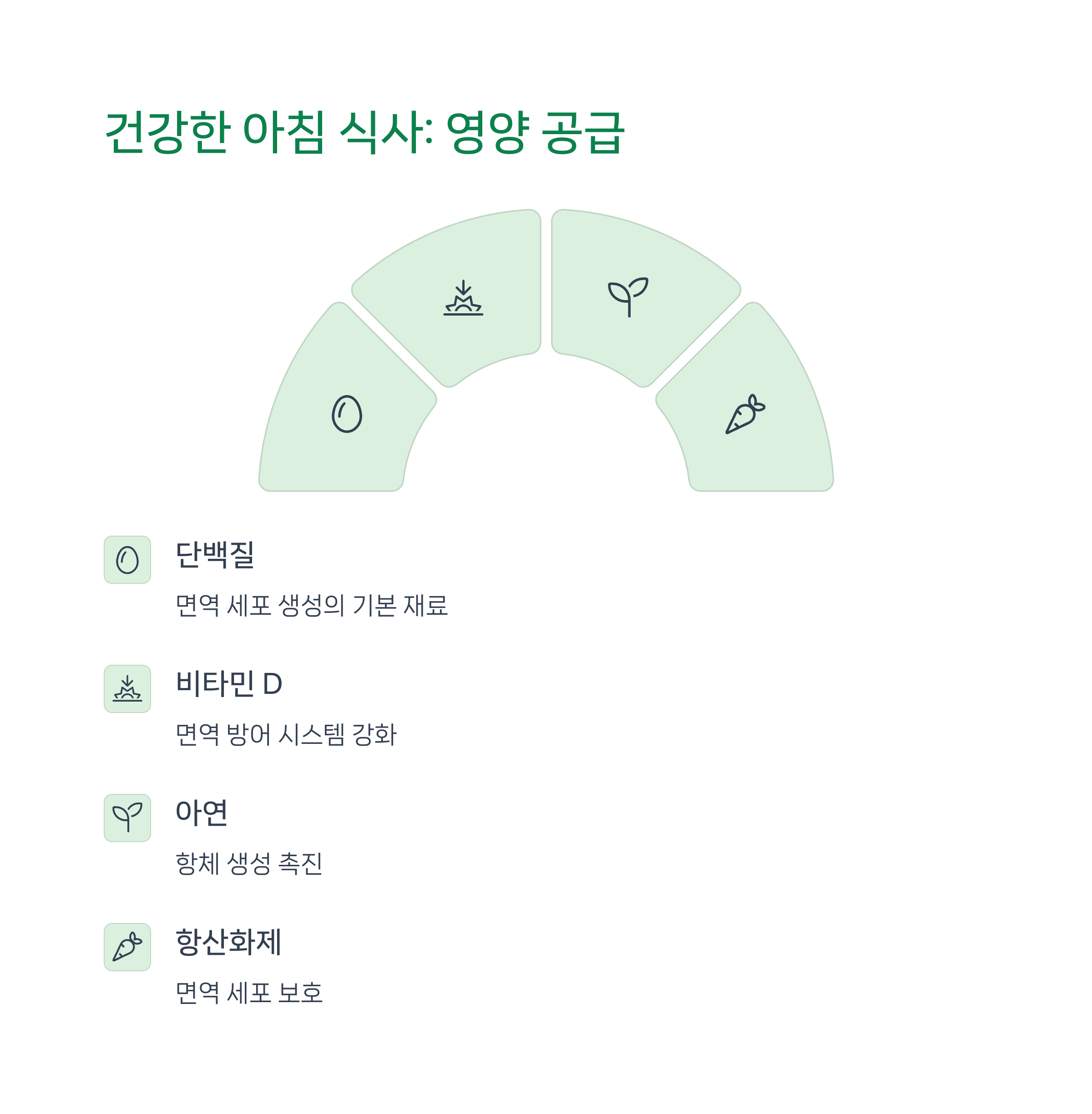 마지막으로 소개할 방법은 아침 식사입니다. 면역력 증진을 위해서는 단백질, 비타민, 미네랄이 풍부한 식단이 필수이며, 특히 비타민 C와 D는 면역세포를 활발하게 만들고 감염 예방에 도움을 줍니다. 바쁜 아침에도 삶은 달걀, 바나나, 요거트처럼 간단하지만 영양이 풍부한 식단을 구성해 보세요. 아침을 거르는 습관은 하루의 에너지 부족뿐 아니라 면역 저하로 이어질 수 있기 때문에 반드시 피해야 합니다.