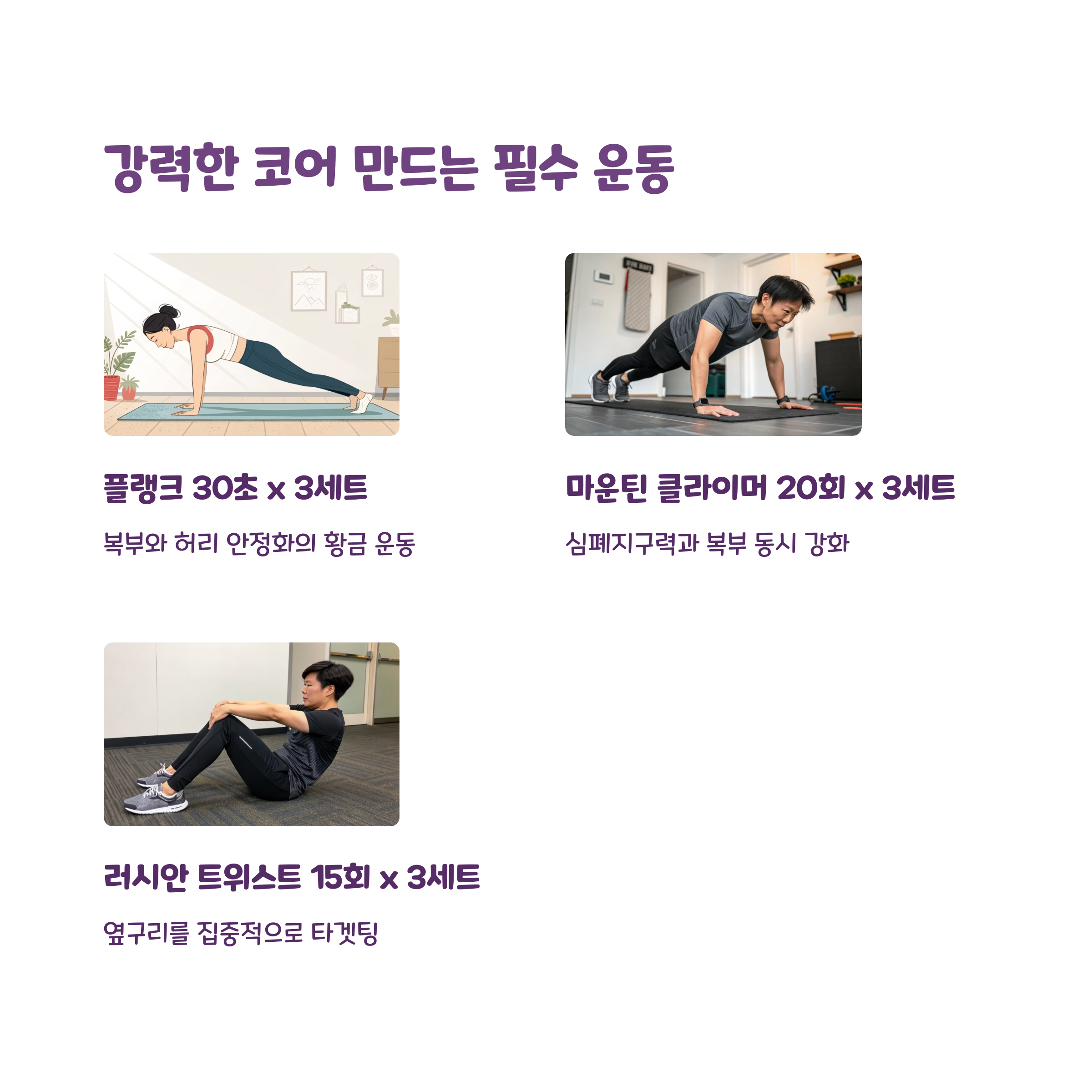 코어는 몸의 중심이에요. 코어가 약하면 아무리 다른 부위 운동을 열심히 해도 효과가 덜하답니다. 복부뿐 아니라 등, 골반 주변까지 아우르는 게 바로 코어 운동이에요. 특히 집에서 운동할 때는 장비 없이도 가능한 동작들로 구성하면 좋습니다.