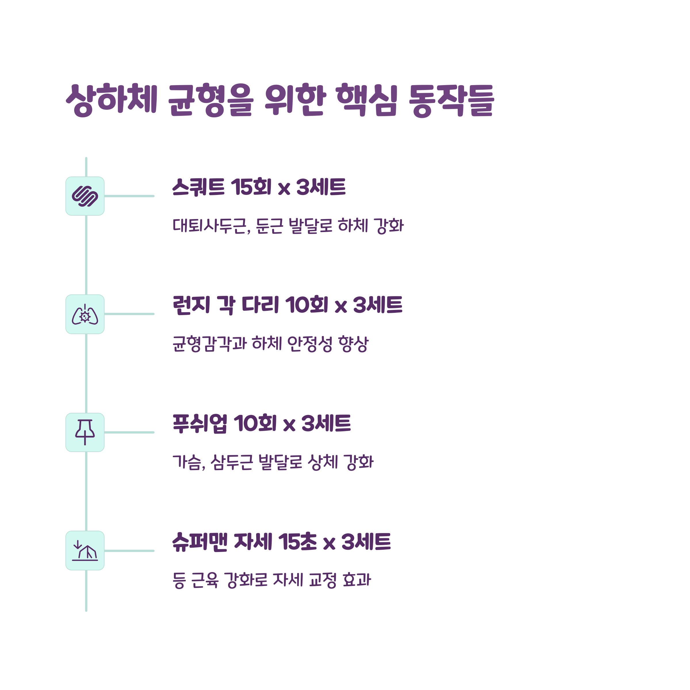 | 슈퍼맨 자세 | 20초 유지 x 3회 | 목에 힘 주지 않기 |