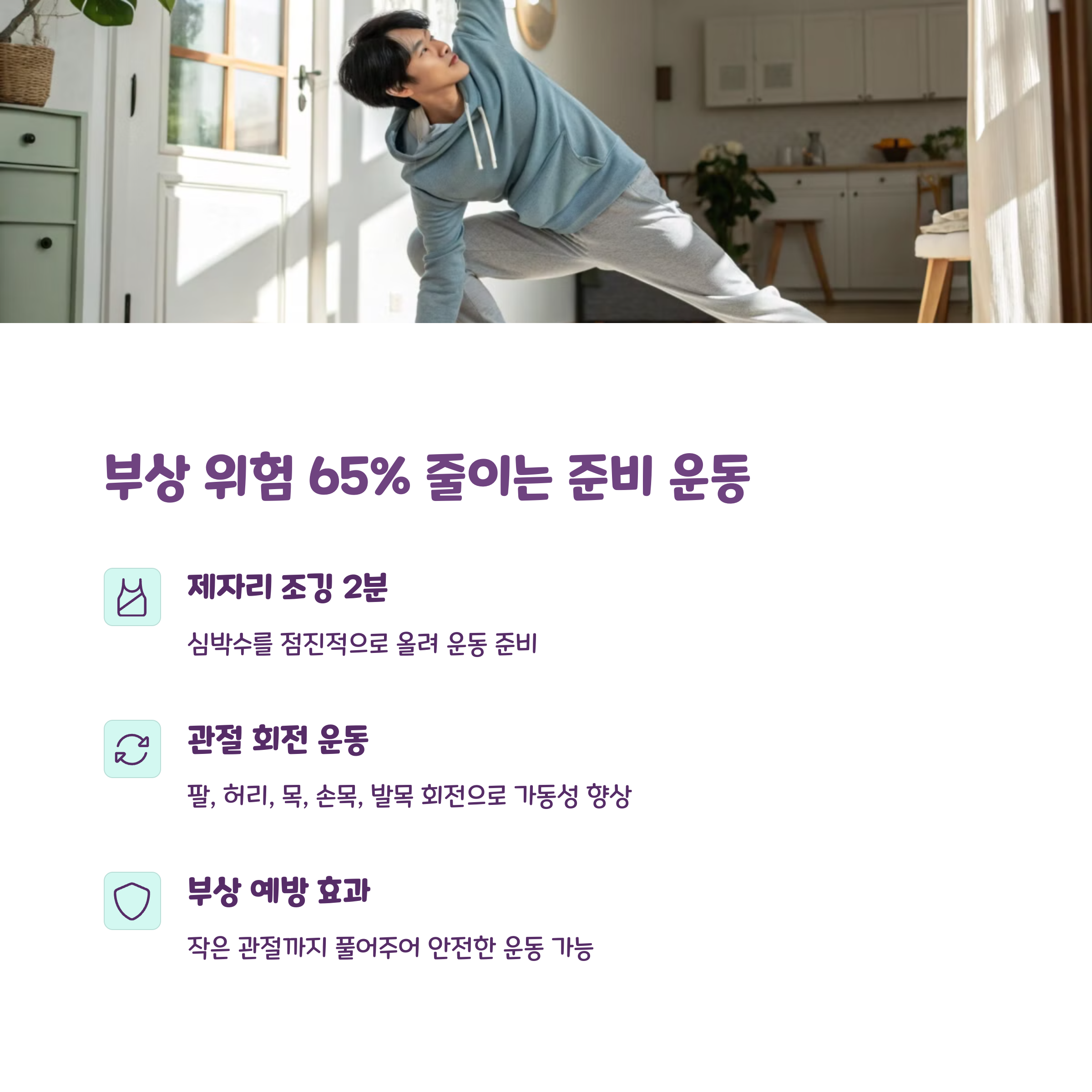 운동을 시작하기 전에는 꼭 몸을 풀어줘야 해요. 안 그러면 근육이 놀라서 부상 위험이 높아지거든요. 저 같은 경우는 예전에 준비운동 없이 바로 운동했다가 허리 삐끗해서 일주일을 고생한 적도 있었어요. 준비 운동은 단 5분이면 충분해요! 심박수를 살짝 올리고 관절을 부드럽게 해주는 게 핵심이에요.