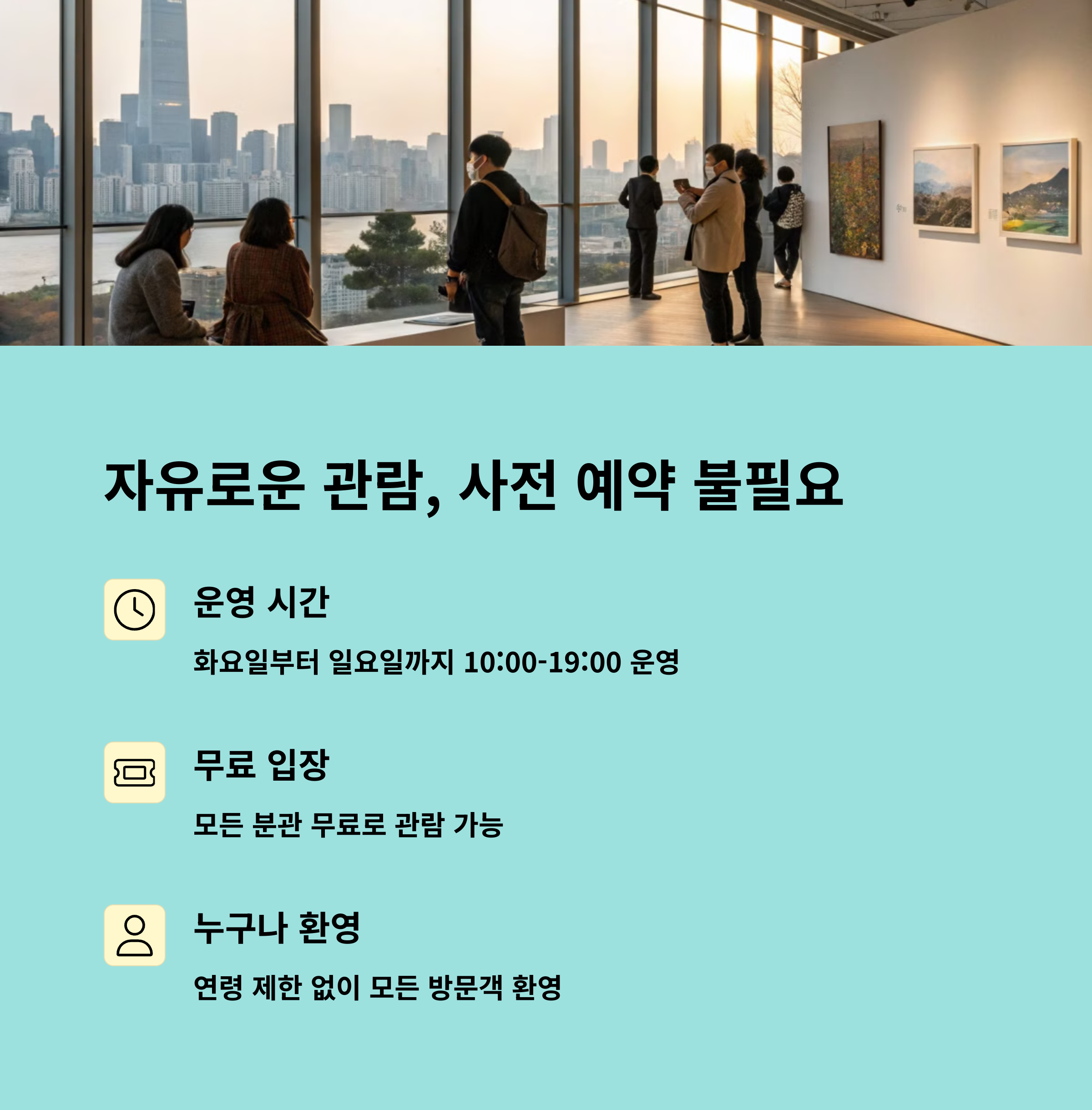 | 서울 내 7개 분관 운영, 접근성 우수 | 누구나 관람 가능, 사전예약 불필요 | 참신한 시도, 새로운 예술 표현 방식 |