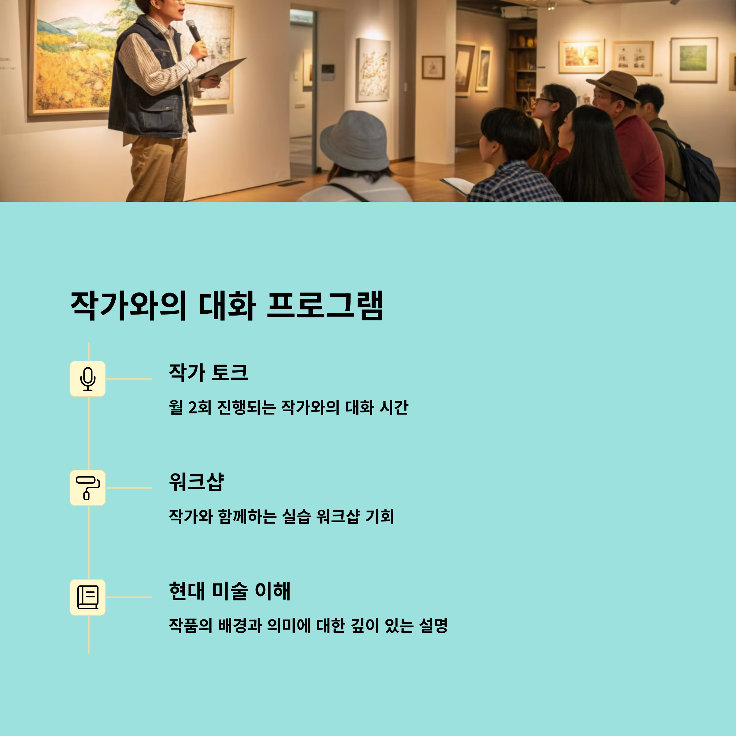 | 경복궁, 북서울, 난지 등 위치 | 일부 전시는 해설 프로그램 포함 | 젊은 감각의 예술가와 직접 소통 가능 |