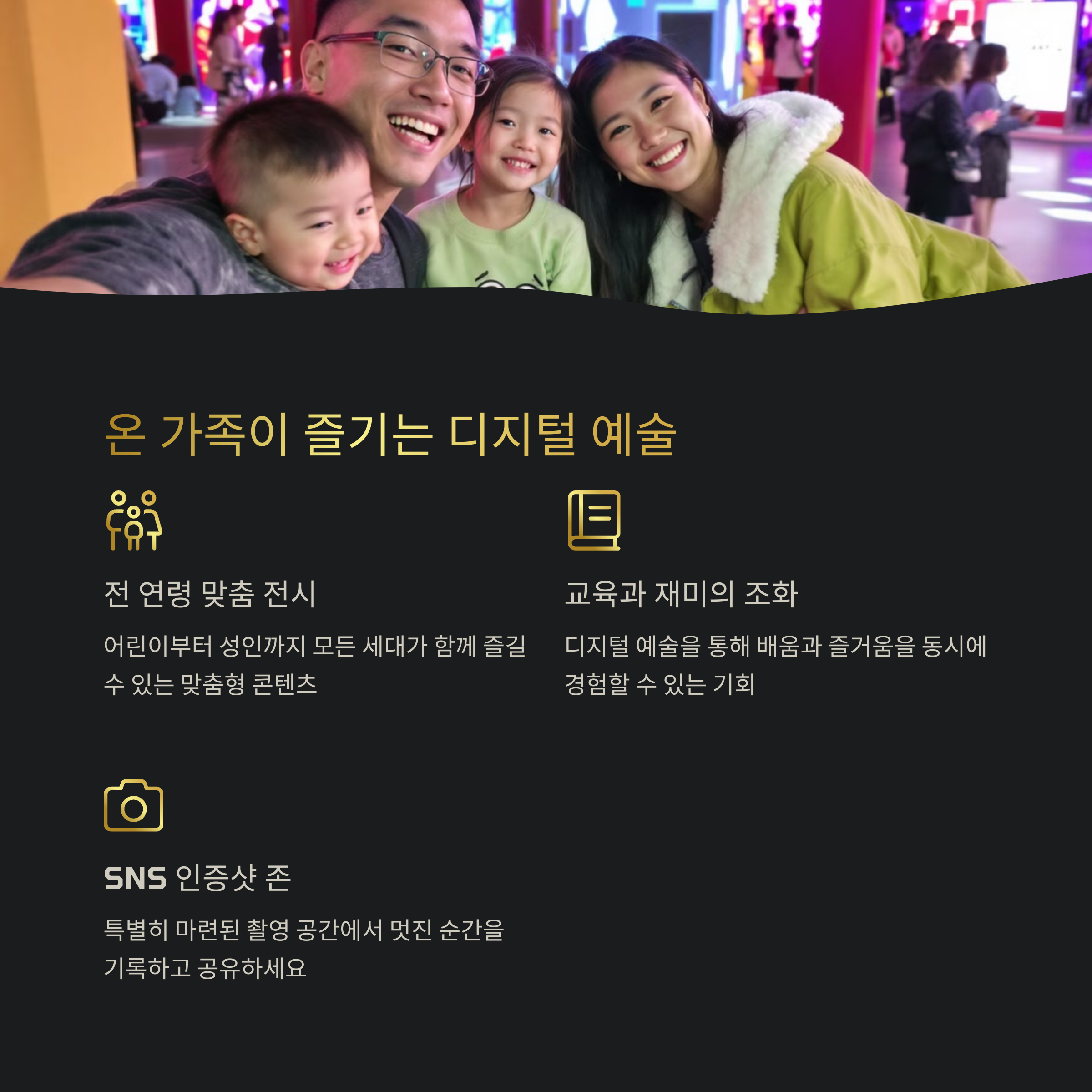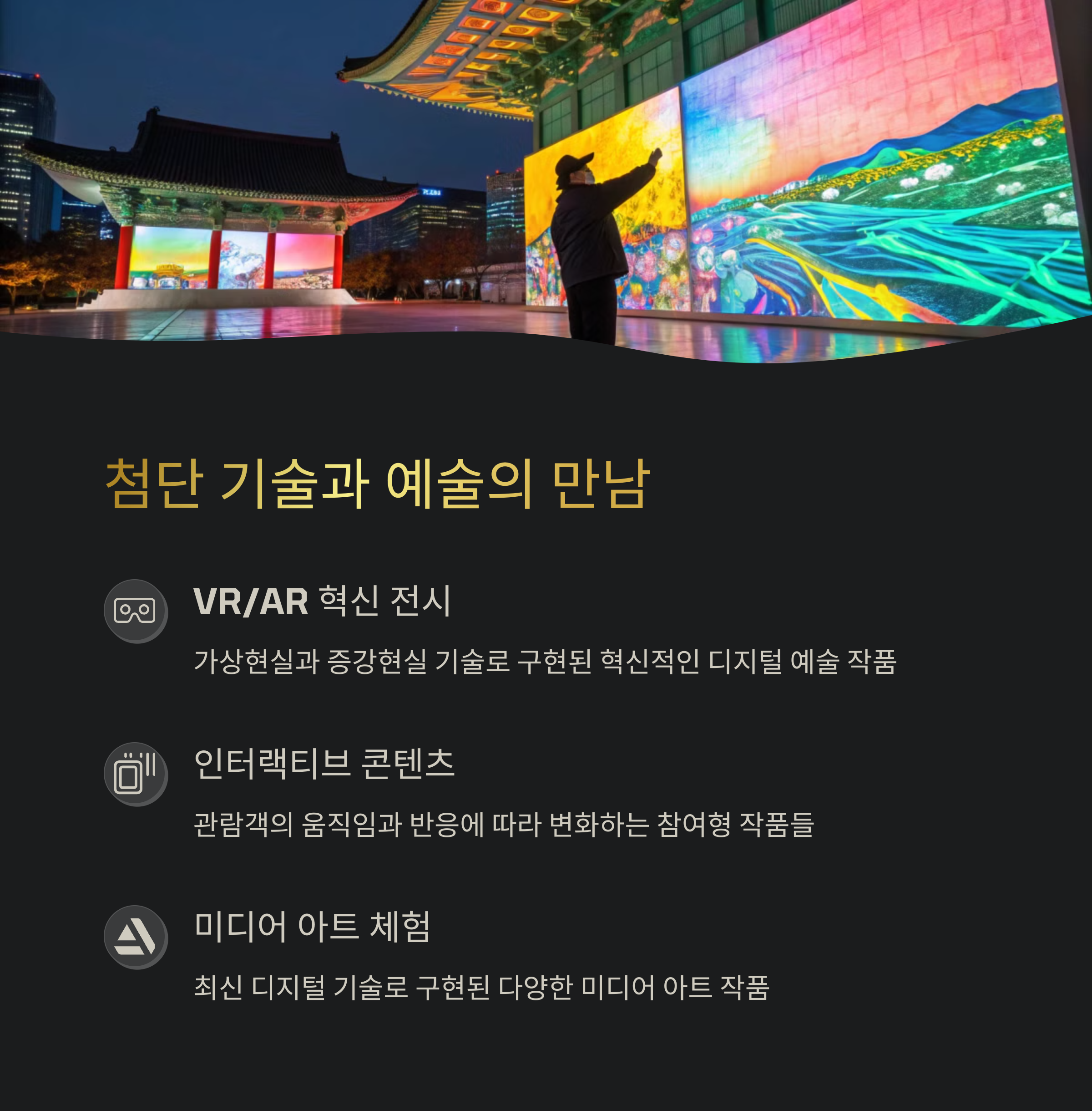| 야경과 조명도 아름다운 사진 명소 | 인터랙티브, VR, AR 등 다양한 기술 활용 | 남녀노소 모두 즐길 수 있는 예술 공간 |