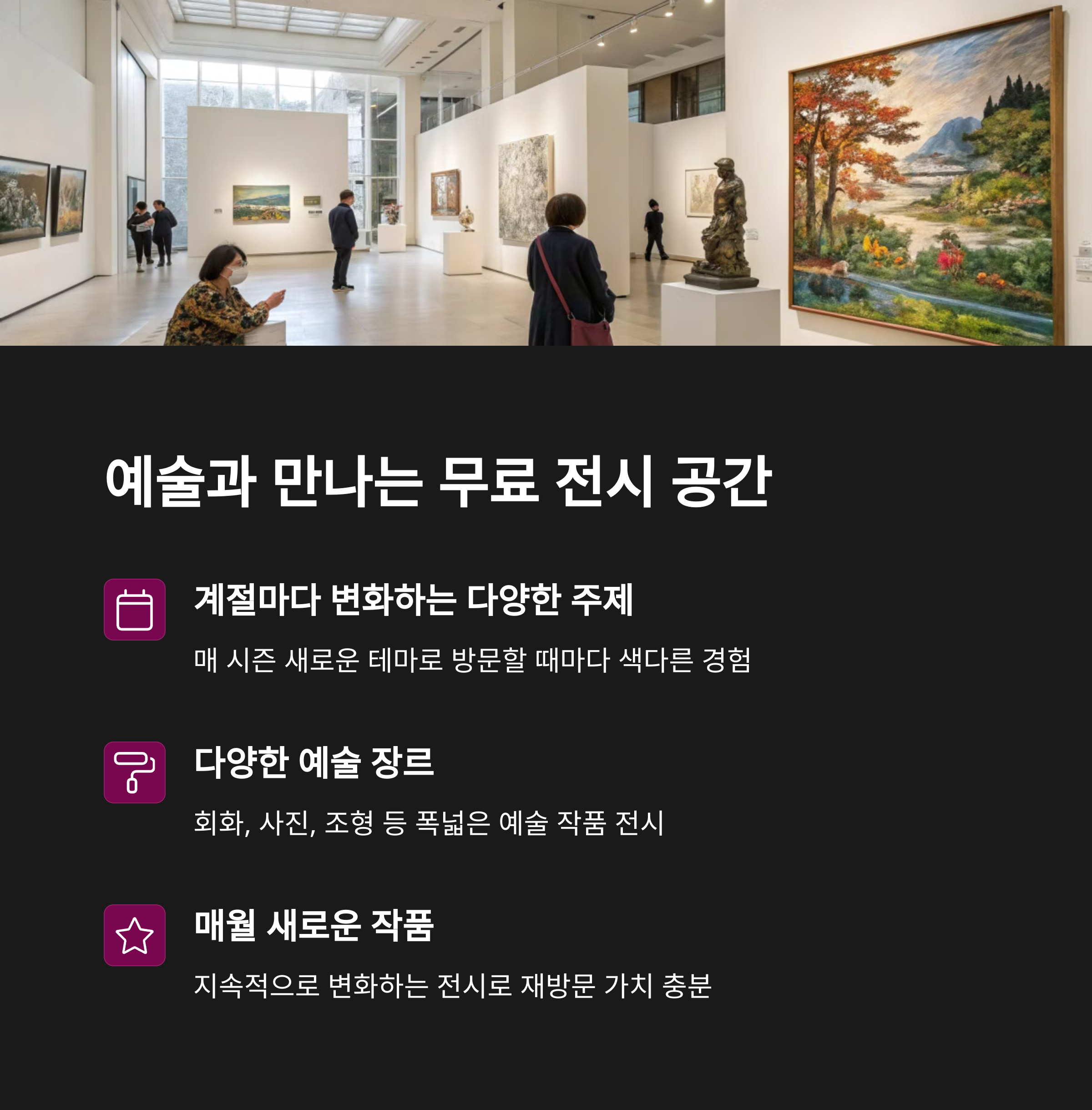 | 무료 전시 특징 | 다양한 주제의 전시가 계절별로 무료 운영됨 |
