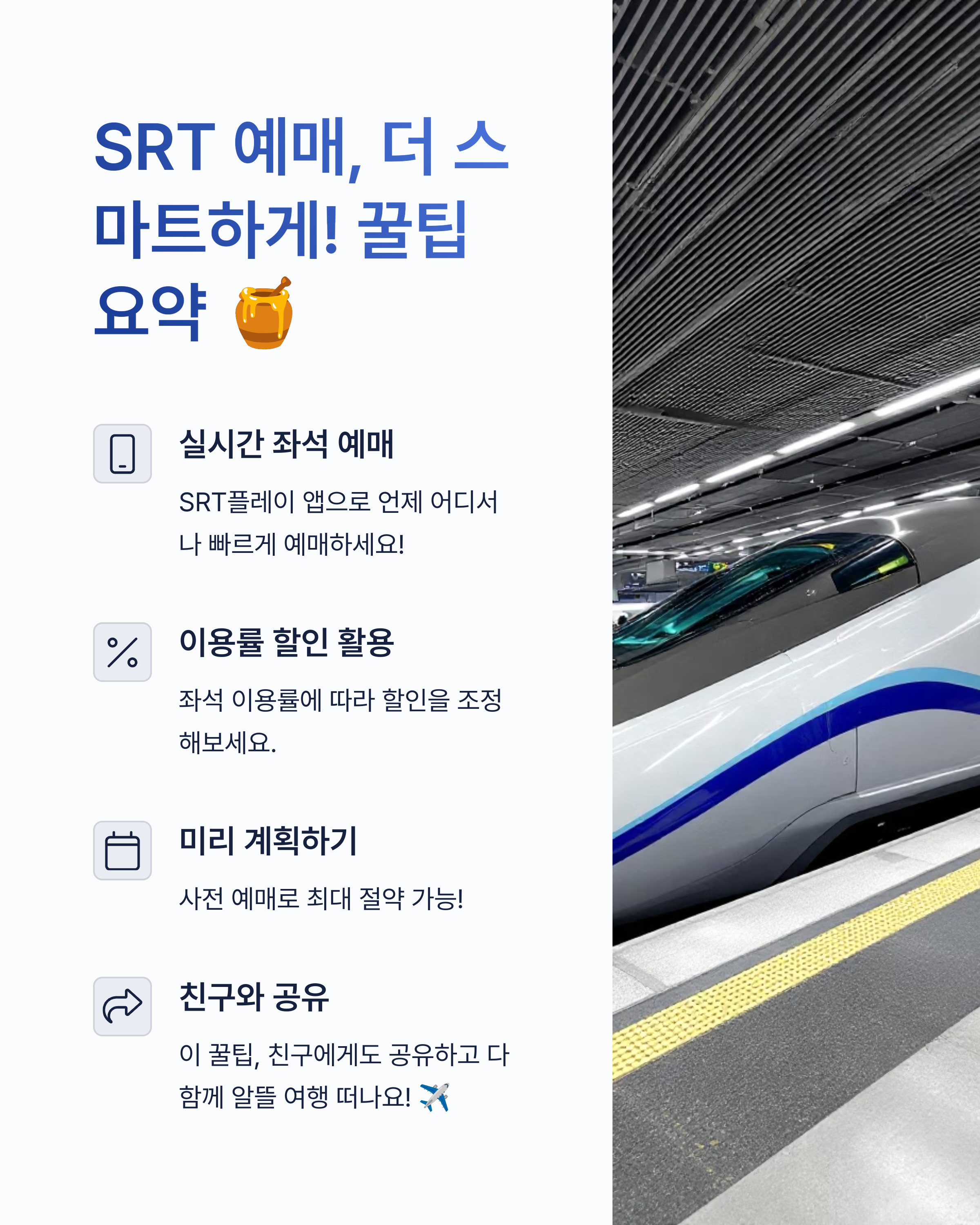 | SRT 조기예매 | 일정 미리 잡으면 최대 30%까지 할인 가능 |
