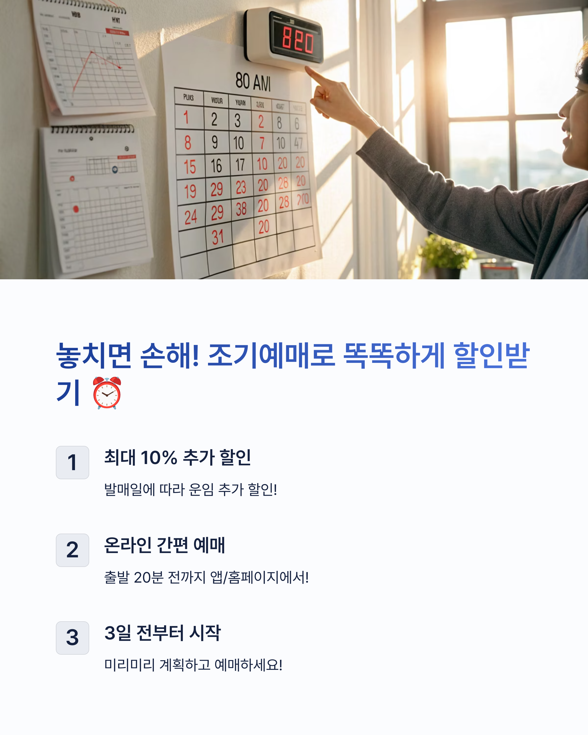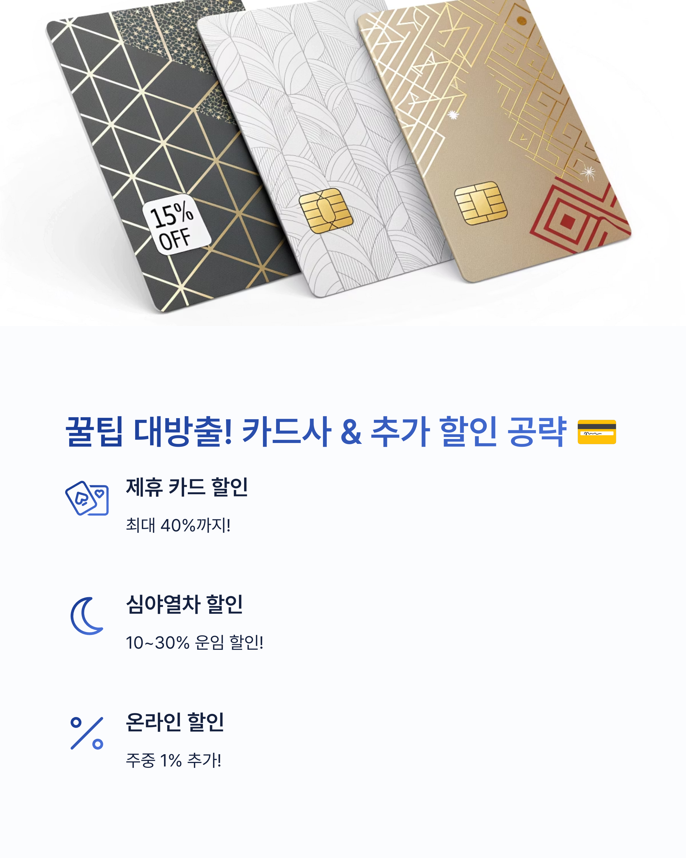 | 출발일 기준 3일 전부터 적용 | 사전 등록으로 자동 할인 가능 | 로그인 후 간편 예약 가능 |