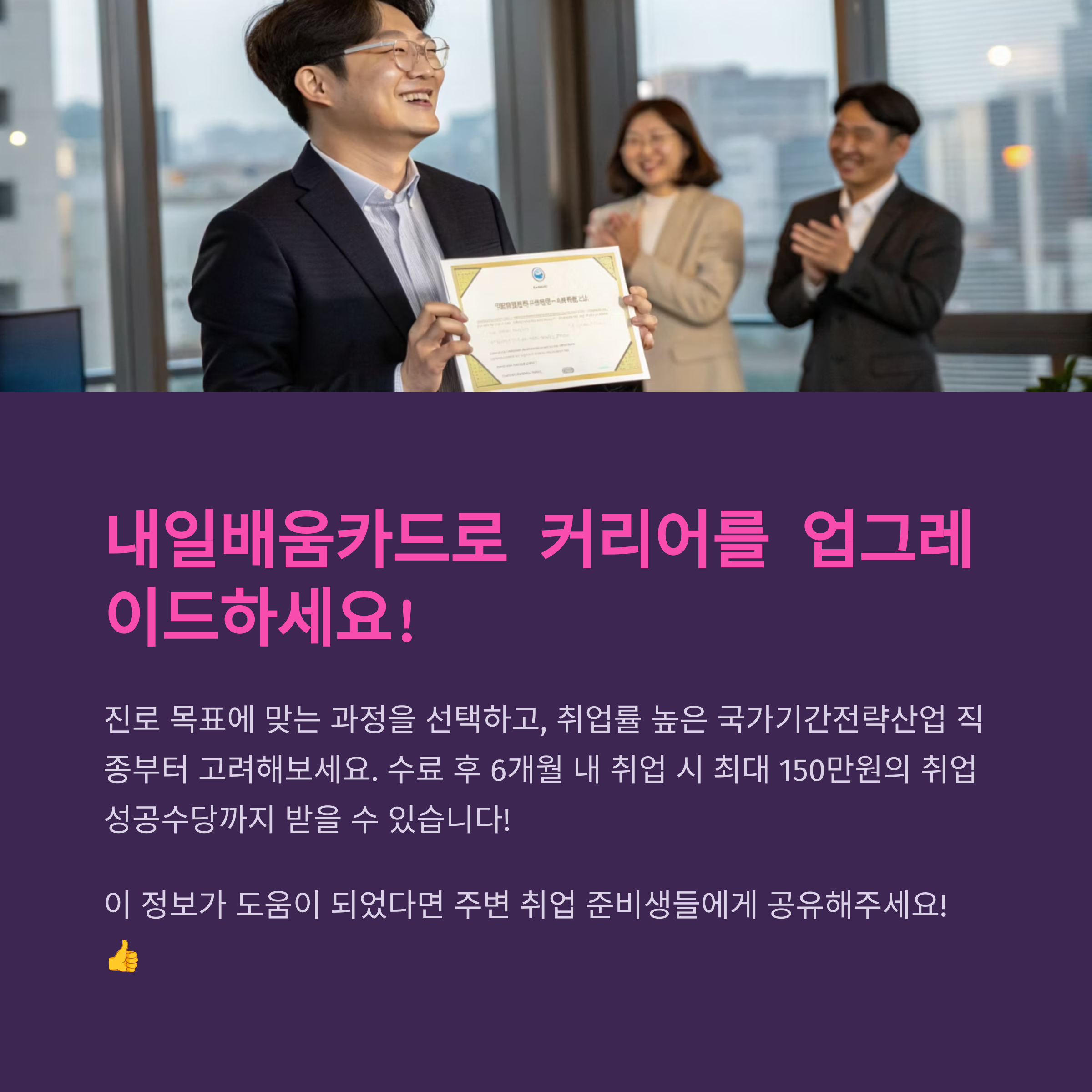 총 300~500만원까지 교육비를 지원받을 수 있어, 취업 경쟁력을 키우는 데 큰 도움이 됩니다 😊